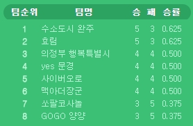 이 밖에 수소도시완주는 3지명 강훈 9단이 양양의 1지명 김영삼 9단을 꺾는 활약으로 5승3패 1위를 마크했고, 효림 역시 72세의 노장 서봉수 9단이 문경 1지명 김영환 9단을 꺾는 결승점을 올리는 등 오전 내내 노장들의 승부혼이 쌀쌀해진 대국장을 달궜다.