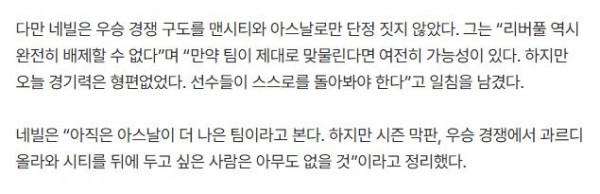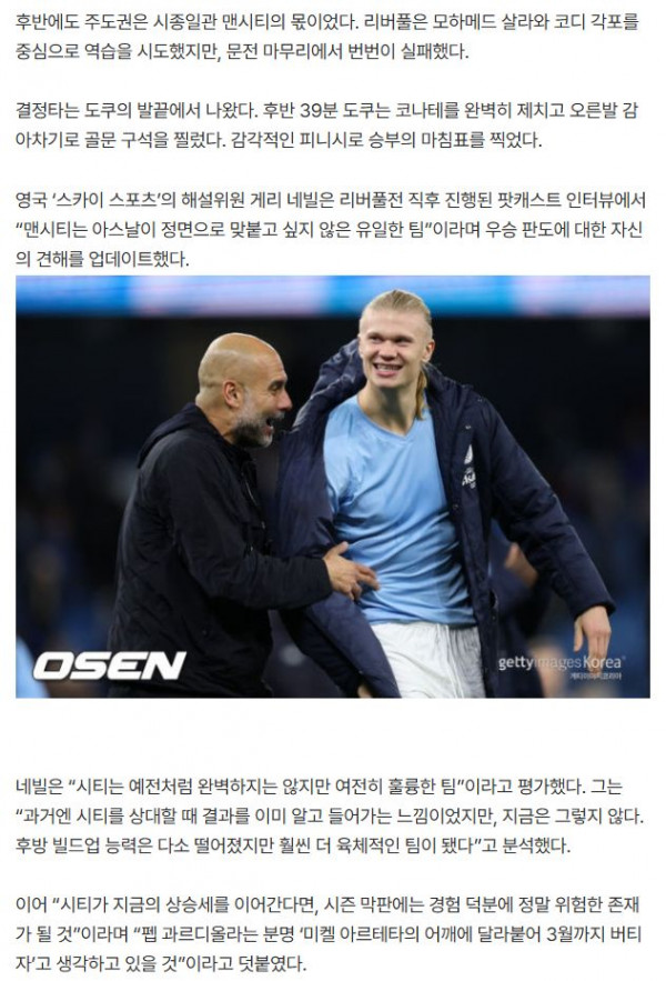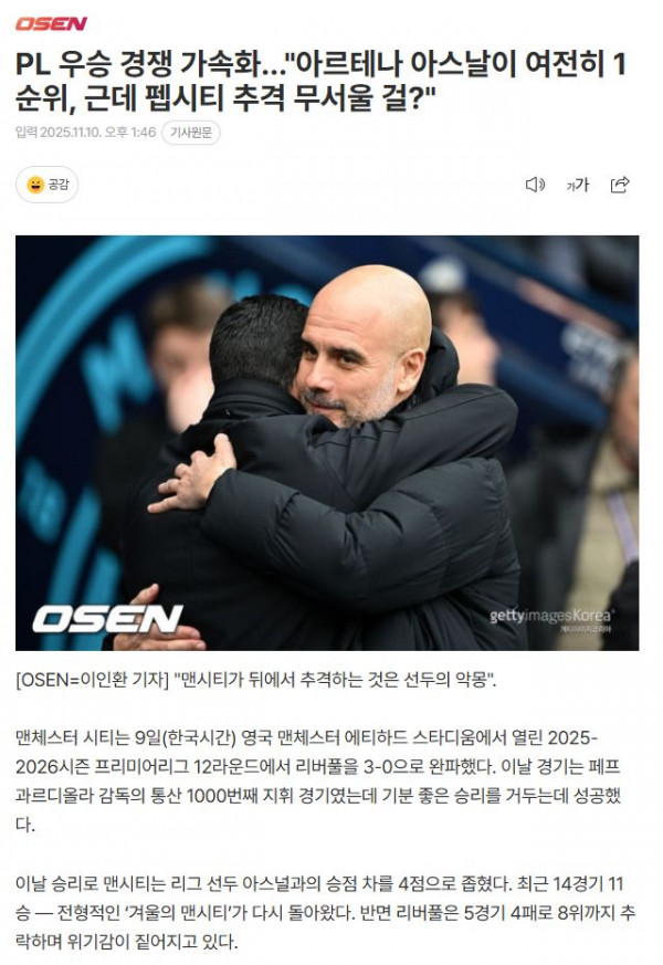 PL 우승 경쟁 가속화..."아르테나 아스날이 여전히 1순위, 근데 펩시티 추격 무서울 걸?"