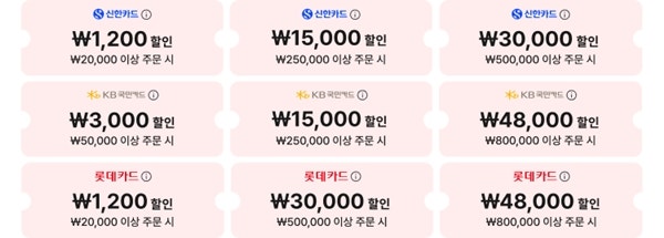 - 100달러 이상 구매 시, 15달러 즉시 할인: 신한카드, BCMastercard, NH농협카드, 하나 VISA 카드, 신한 Mastercard, 우리 Mastercard, 신한 VISA 카드