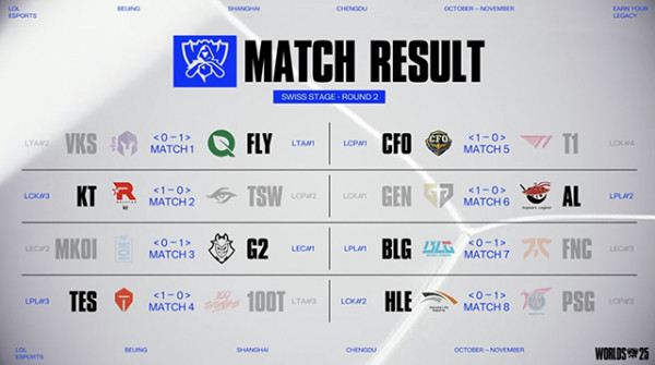 15일 중국 베이징 스마트 이스포츠 센터에서 열린 열린 '2025 리그 오브 레전드 월드 챔피언십(롤드컵)' 스위스 스테이지 2라운드 경기에서 KT 롤스터가 2승을, T1과 젠지 e스포츠가 패하며 1승 1패를, 첫 날 패했던 한화생명e스포츠는 뒤늦게 승리하며 역시 1승 1패를 기록했다.