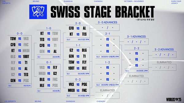 3승을 하면 8강으로, 3패를 하면 탈락하는 스위스 스테이지는 진출과 탈락이 결정되는 경기는 3판 2선승제 피어리스로 드래프트로 진행된다.