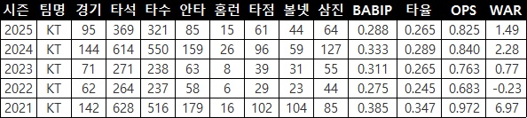 이는 지난 2021시즌 KT의 첫 통합 우승을 이끌었던 커리어 하이 시즌(OPS 0.972 WAR 6.97)에 비하면 아쉬움이 남을 수밖에 없는 성적이다.