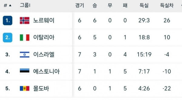 | 순위 | 팀 | 경기 | 승 | 무 | 패 | 승점 |