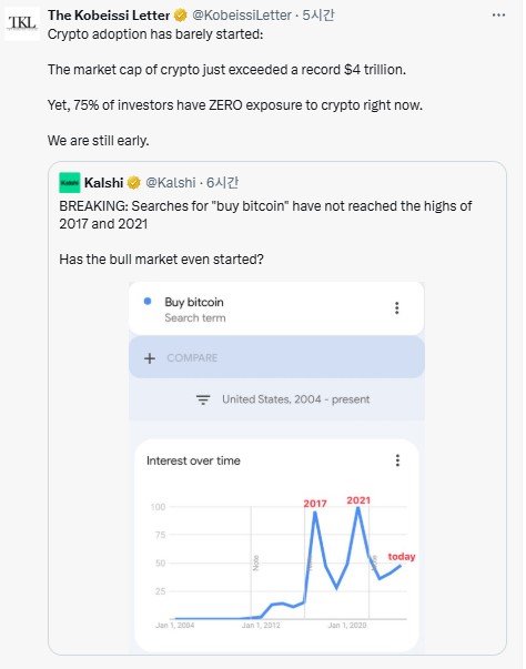 [블록미디어 최창환 기자]암호화폐 시장이 사상 최초로 4조달러의 시가총액을 기록하고 있지만 개인 투자자의 관심은 여전히 제한적인 수준에 머물고 있는 것으로 나타났다.