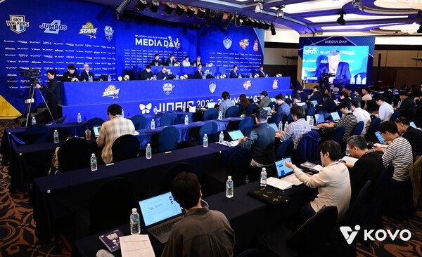 이날 7개 구단 감독을 비롯해 신호진 바야르사이한(이상 현대캐피탈) 정한용 러셀(이상 대한항공) 임성진 야쿱(이상 KB손해보험) 김지한 아라우조(이상 우리카드) 김준우 아히(이상 삼성화재) 김정호 베논(이상 한국전력) 전광인 오데이(이상 OK저축은행) 등 각팀 국내 선수·외국인 선수 각각 1명씩 참석해 출사표를 밝혔다.