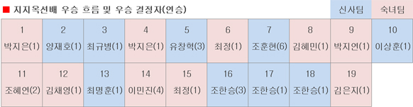 숙녀팀에서는 최정 9단이 대역전극의 발판을 놓은 6연승, 오유진 9단이 허리를 받쳐준 추격의 3연승, 그리고 김은지 9단이 끝내기 3연승으로 활약했다.