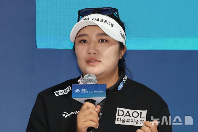 [해남=뉴시스] 권창회 기자 = 15일 오후 전남 해남 파인비치 골프링크스에서 열린 BMW 레이디스 챔피언십 2025 미디어데이에서 윤이나가 취재진 질문에 답하고 있다. 2025.10.15. [email protected]