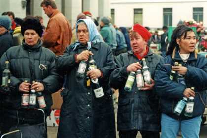 야로슬라프스키 역 벽 근처에서의 주류 노점상. 모스크바, 1992년.