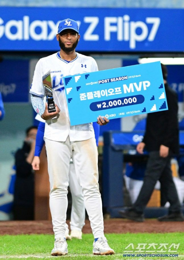 4차전 결승타를 때린 디아즈는 기자단 투표에서 75표 중 42표, 득표율 56%를 기록하며 원태인(25표)을 제치고 시리즈 MVP에 올랐다.