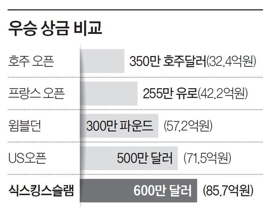 사우디 리야드에서 15일 개막하는 2025 식스킹스슬램 테니스대회는 총상금 규모가 1350만 달러(192억5000만원)다. 출전 선수는 단 6명. 출전만 해도 150만 달러(약 21억4000만원)를 받고, 우승자는 그 4배인 600만 달러(약 85억7000만원)의 상금을 거머쥔다. 4대 메이저대회 중 최다 우승상금 대회인 US오픈(500만 달러)보다 많다.