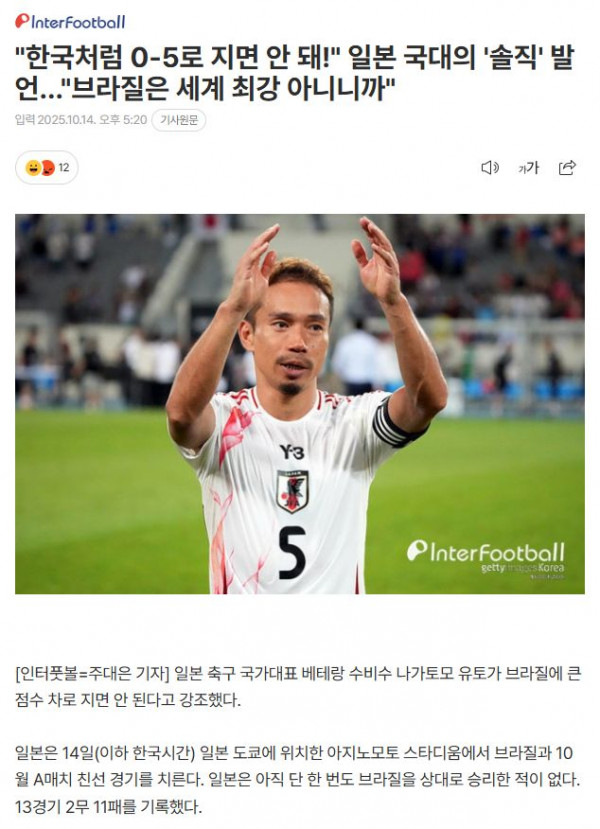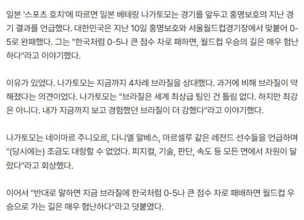"한국처럼 0-5로 지면 안 돼!" 일본 국대의 '솔직' 발언…"브라질은 세계 최강 아니니까"