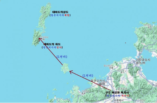 는 축자국(규수 후쿠오카)에서 2천리 거리에 있고