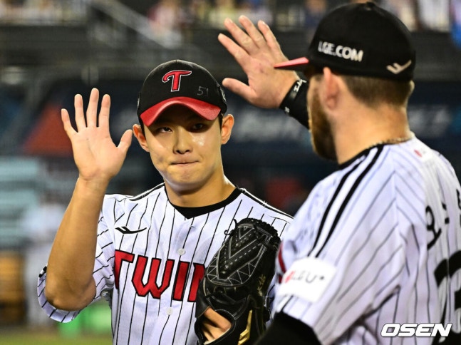 [OSEN=잠실, 지형준 기자] 30일 서울 잠실구장에서 ‘2025 신한 SOL Bank KBO리그’ LG 트윈스와 두산 베어스의 시즌 16차전이 열렸다.LG는 정규시즌 우승 매직넘버가 ‘1’이다. 승리를 한다면, 우승을 결정짓게 된다. 9위가 확정된 두산은 시즌 최종전이다. LG는 송승기, 두산은 콜어빈이 선발로 나섰다.6회초 수비를 마치고 LG 김영우가 오스틴과 하이파이브를 하고 있다. 2025.09.30 /[email protected]