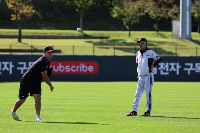 LG 염경엽 감독(오른쪽)이 이천 LG 챔피언스파크에서 2025 한국시리즈 대비 합숙 훈련에서 장현식을 지켜보고 있다. /사진=LG 트윈스 제공