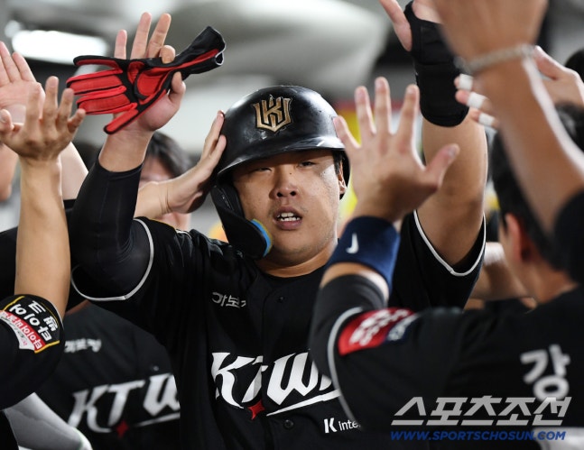 1일 광주 기아챔피언스필드에서 열린 KT-KIA전. 3회초 2사 1, 3루 황재균의 적시타 때 득점한 강백호가 환영받고 있다. 광주=정재근 기자 [email protected]/2025.10.1/