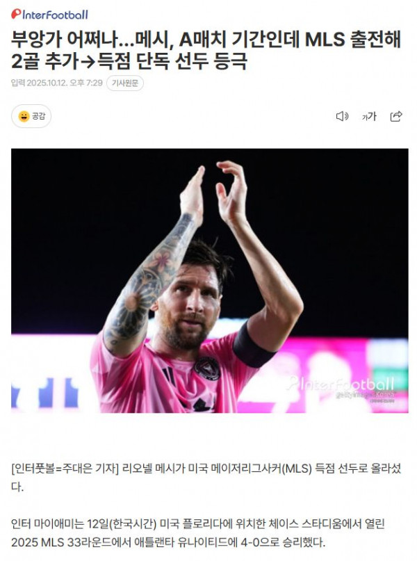 부앙가 어쩌나…메시, A매치 기간인데 MLS 출전해 2골 추가→득점 단독 선두 등극