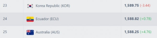 한국이 브라질에 패배하는 동안 24위 에콰도르는 16위 미국과 1-1로 비겼다. 심지어 25위 호주는 26위 캐나다를 상대로 1-0으로 승리했다.