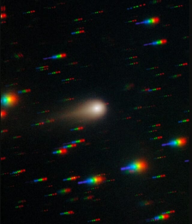 칠레에 위치한 제미니 사우스 망원경으로 촬영한 사진에서 혜성 3I/ATLAS가 빽빽한 별빛 속을 가로지르고 있다. 여러 색깔의 줄무늬는 주위에 있는 별들이다.(출처=International Gemini Observatory/NOIRLab/NSF/AURA/Shadow the Scientist)