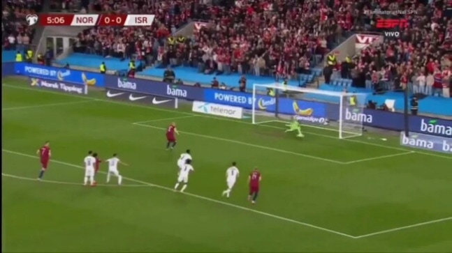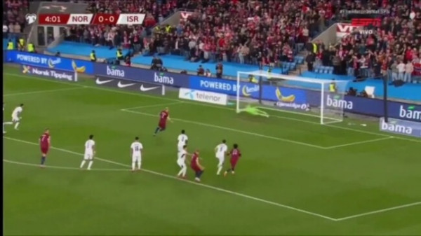 이스라엘이 안도의 한숨을 삼키려는 찰나, 홀란드에게 다시 만회할 기회가 주어졌다. 주심은 노르웨이 선수들이 홀란드가 페널티킥을 차는 순간 라인을 넘었다고 판정하고 페널티킥을 재선언했다. 이번에는 홀란드가 원래 찼던 반대 방향으로 시도했는데, 페레스 골키퍼가 또다시 방향을 읽고 공을 걷어냈다.