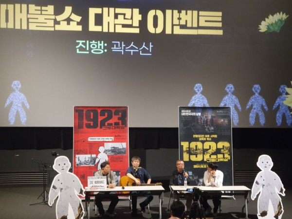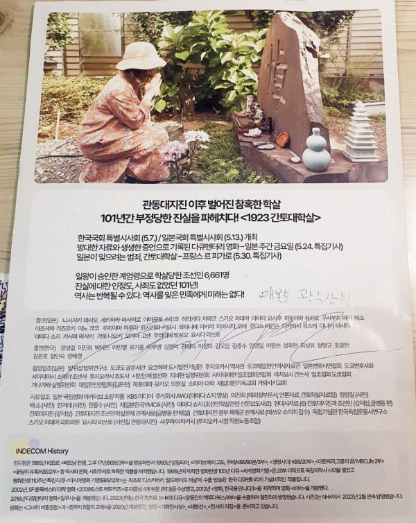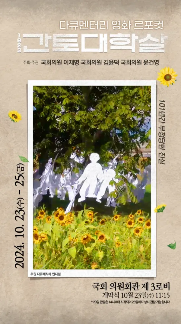 당시, 국회에서는 의원 신분이셨던 현 이재명 대통령님과 김윤덕, 윤건영의원님의 주최로 그해 8월 광복절에 개봉했었던 "1923 간토대학살"을 국회회관에서 상영하며 1923년 일본 정부의 사실상 묵인하에 일본인들의 잔혹함에 학살된 당시 조선인들의 비극과 이에 관련하여 현재까지도 사실 규명을 위함과 억울함을 달래주기위해 해마다 제를 올리는 시민단체의 모습과 감독님의 증거를 찾기 위한 노력을 꾸밈없이 보여주었고 국회 주최측은 이 다큐를 통해 "간토대학살 특별법"을 속히 진행하여 사실규명을 위해 노력하겠다는 모습을 보여주었습니다.