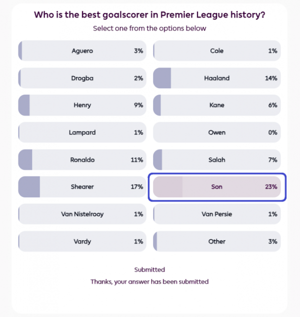 [골닷컴] 강동훈 기자 = ‘손세이셔널’ 손흥민(33·로스앤젤레스 FC)이 잉글랜드 프리미어리그(EPL) 역대 최고의 골잡이를 뽑는 팬 투표 후보 15인에 선정된 데에 이어 현재 득표율 23%로 예상을 깨고 단독 1위를 달리고 있다. 손흥민이 수많은 레전드들을 제치고 EPL 역대 최고의 골잡이로 등극하면서 새로운 역사를 쓸 수 있을지 주목된다.