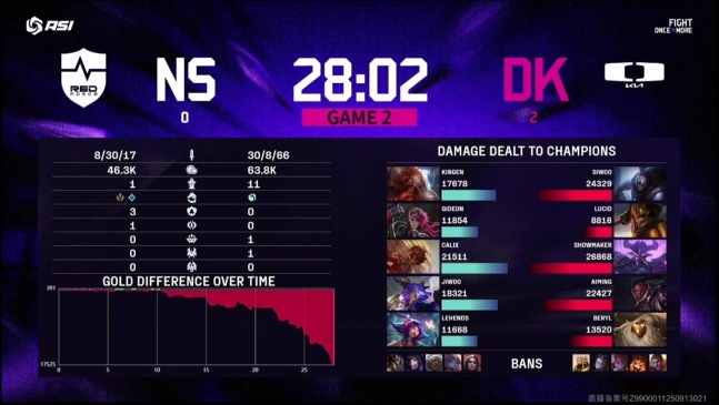 결정적으로 바텀 전투까지 대승을 거둔 DK는 23분 기준 골드 차이를 8,000까지 벌리며 승기를 굳혔고, 바론 처치 후 무난히 농심을 제압하며 가장 먼저 ASI 결승 진출에 성공했다.