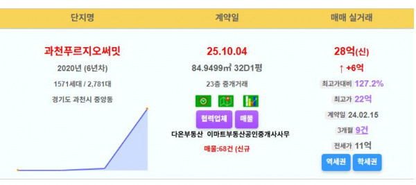 과천시 과천푸르지오써밋 32평 28억 신고가