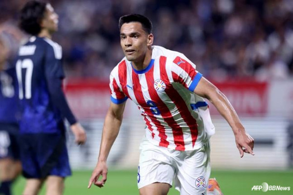 디에고 고메스가 10일 오후 7시 20분 일본 수이타의 파나소닉 스타디움에서 열린 친선경기에서 일본에 파라과이의 두 번째 골을 기록한 뒤 세리머니하고 있다. /AFPBBNews=뉴스1