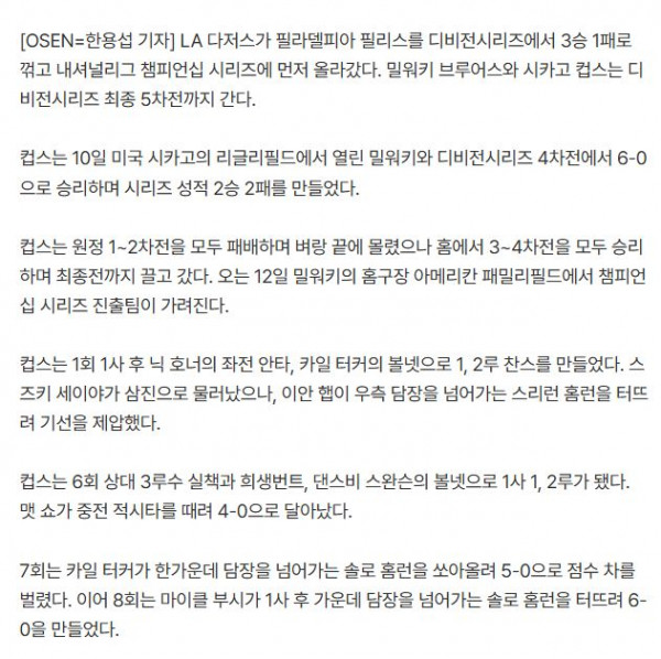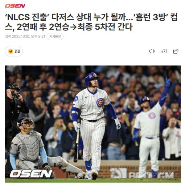 ‘NLCS 진출’ 다저스 상대 누가 될까...‘홈런 3방’ 컵스, 2연패 후 2연승→최종 5차전 간다