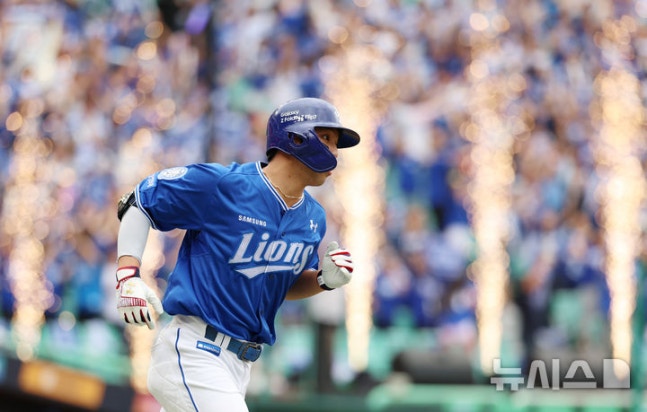 [인천=뉴시스] 조성우 기자 = 9일 인천 미추홀구 SSG랜더스필드에서 열린 2025 KBO 포스트시즌 준플레이오프 1차전 삼성 라이온즈와 SSG 랜더스의 경기, 삼성 3회초 공격 무사 주자 1루서 김영웅이 2점 홈런을 때린 뒤 그라운드를 돌고 있다. 2025.10.09. [email protected]