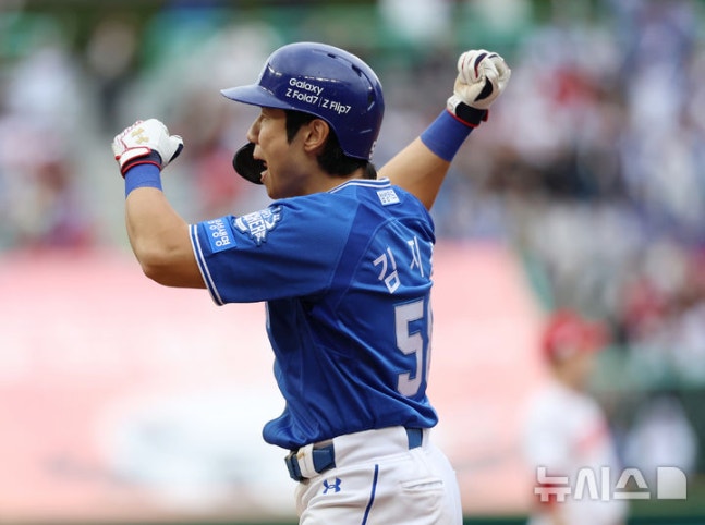 [인천=뉴시스] 조성우 기자 = 9일 인천 미추홀구 SSG랜더스필드에서 열린 2025 KBO 포스트시즌 준플레이오프 1차전 삼성 라이온즈와 SSG 랜더스의 경기, 삼성 4회초 공격 1사 주자 2루서 김지찬이 1타점 적시타를 때리며 출루하고 있다. 2025.10.09. [email protected]