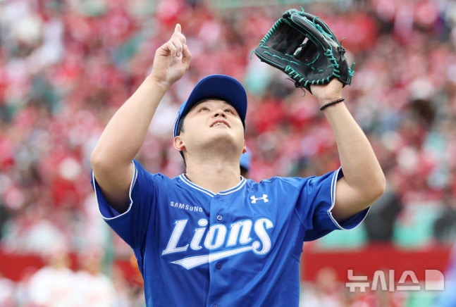 [인천=뉴시스] 조성우 기자 = 9일 인천 미추홀구 SSG랜더스필드에서 열린 2025 KBO 포스트시즌 준플레이오프 1차전 삼성 라이온즈와 SSG 랜더스의 경기, 삼성 선발투수 최원태가 SGG 6회말 공격을 무실점으로 막은 뒤 마운드를 내려오며 세리머니를 하고 있다. 2025.10.09. [email protected]