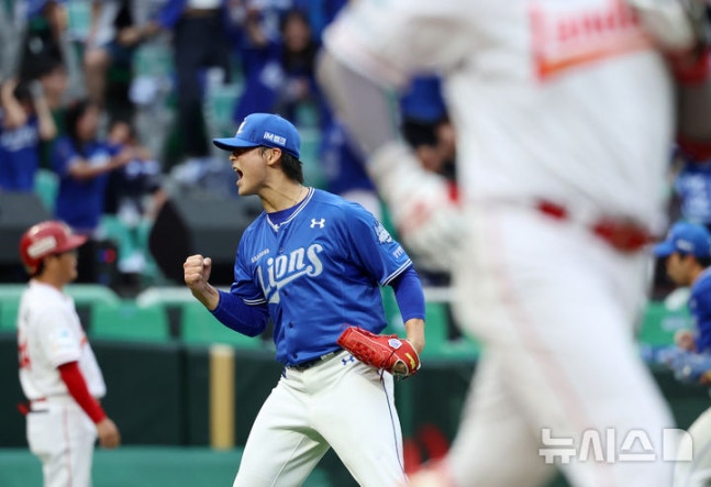 [인천=뉴시스] 조성우 기자 = 9일 인천 미추홀구 SSG랜더스필드에서 열린 2025 KBO 포스트시즌 준플레이오프 1차전 삼성 라이온즈와 SSG 랜더스의 경기, 삼성 투수 이호성이 SSG 8회말 공격 2사 주자 만루서 고명준을 범타 처리하며 실점 위기를 넘긴 뒤 환호하고 있다. 2025.10.09. [email protected]