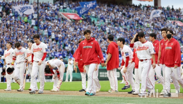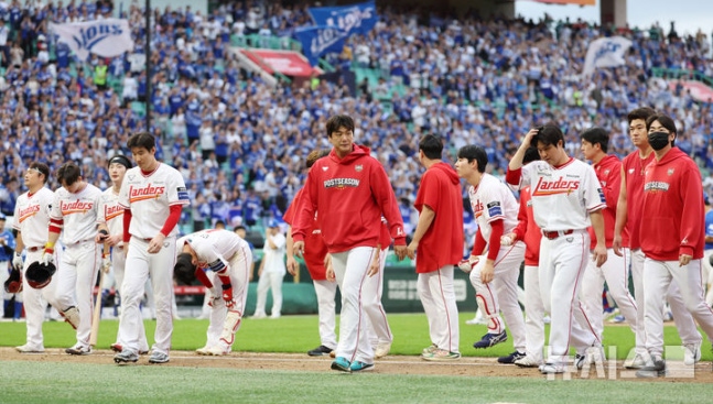 [인천=뉴시스] 조성우 기자 = 9일 인천 미추홀구 SSG랜더스필드에서 열린 2025 KBO 포스트시즌 준플레이오프 1차전 삼성 라이온즈와 SSG 랜더스의 경기, 삼성에 2-5로 패한 SSG 선수들이 굳은 표정으로 그라운드를 나서고 있다. 2025.10.09. [email protected]