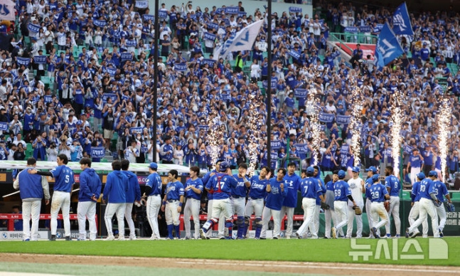 [인천=뉴시스] 조성우 기자 = 9일 인천 미추홀구 SSG랜더스필드에서 열린 2025 KBO 포스트시즌 준플레이오프 1차전 삼성 라이온즈와 SSG 랜더스의 경기, 삼성 선수들이 SSG에 5-2 승리를 거둔 뒤 기뻐하고 있다. 2025.10.09. [email protected]