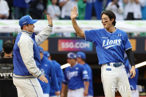 [인천=뉴시스] 조성우 기자 = 9일 인천 미추홀구 SSG랜더스필드에서 열린 2025 KBO 포스트시즌 준플레이오프 1차전 삼성 라이온즈와 SSG 랜더스의 경기, 삼성 3회초 공격 무사 주자 1루서 김영웅이 2점 홈런을 때린 뒤 박진만 감독과 하이파이브 하고 있다. 2025.10.09. [email protected]