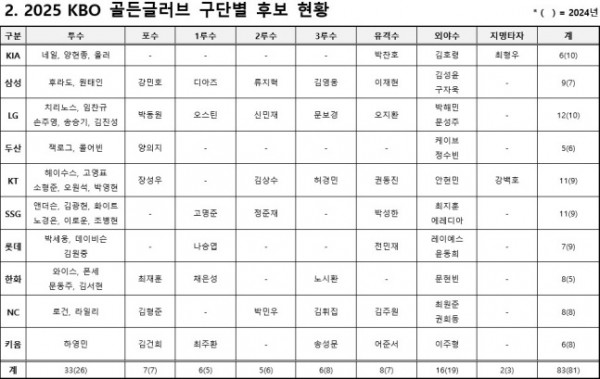 한국야구위원회(KBO)는 9일 2025 신한 SOL뱅크 KBO 골든글러브 후보 83명의 명단을 공개했다.