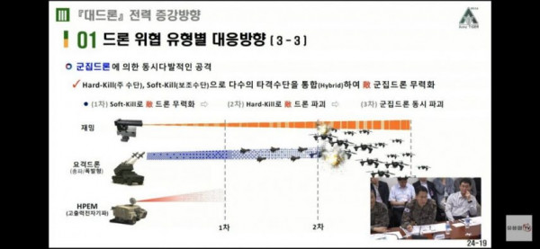 군집드론은 재머(군집드론은 광섬유 못씀)와 요격드론 그리고 고출력전자기기파의 3가지 무기로 무력화하는 등 다층 방공망 도입.