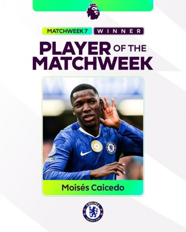 프리미어리그는 지난 7일(한국시간) 공식 SNS를 통해 첼시 미드필더 모이세스 카이세도가 프리미어리그 이주의 선수에 선정됐다고 발표했다.