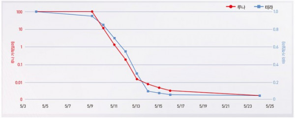 하지만 수학적 알고리즘만으로는 시장에서 스테이블코인의 안정성을 지탱하는 데 한계가 있습니다. 2020년 발행된 알고리즘형 스테이블코인 테라USD(UST)가 그 예입니다. 테라는 자매 코인 루나(LUNA)와 연동된 구조였습니다.