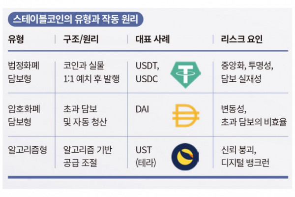 요즘 테크·금융 분야의 뜨거운 이슈는 '스테이블코인'입니다. 스테이블코인은 말 그대로 '안정성'을 지향하는 디지털 화폐입니다. 비트코인처럼 가격이 널뛰지 않고 ‘1코인=1달러' 식의 고정 가치를 유지하도록 설계돼 있어요.