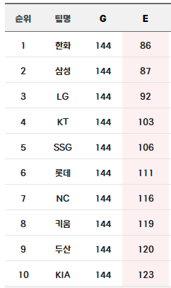 팀 실책도 최소 1위(86개)로 2010년(80개) 이후 15년 만이었다.