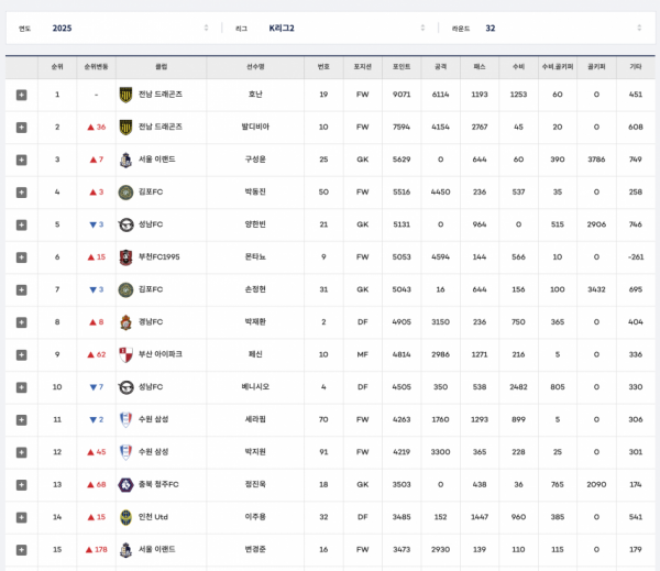 | 순위 | 팀 | 경기 | 승 | 무 | 패 | 승점 |