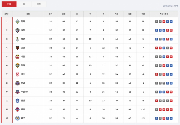 | 순위 | 팀 | 경기 | 승 | 무 | 패 | 승점 |