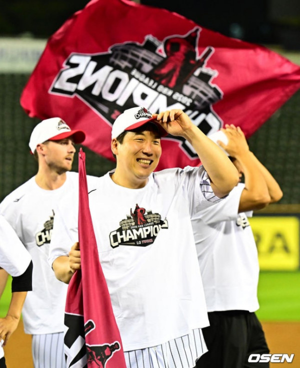 [OSEN=잠실, 지형준 기자] 프로야구 LG 트윈스가 극적으로 2025 정규시즌 우승을 차지했다. LG는 1일 서울 잠실구장에서 열린 2025 KBO리그 NC와 시즌 마지막 경기에서 3-7로 패배했다. 자력 우승이 물거품이 된 LG는 이날 SSG 랜더스가 한화 이글스에 극적인 끝내기 승리를 거두면서 우승을 확정했다. LG 김현수, 치리노스가 우승 세리머니를 하고 있다. LG 김현수가 우승 세리머니를 하고 있다. 2025.10.01 /[email protected]
