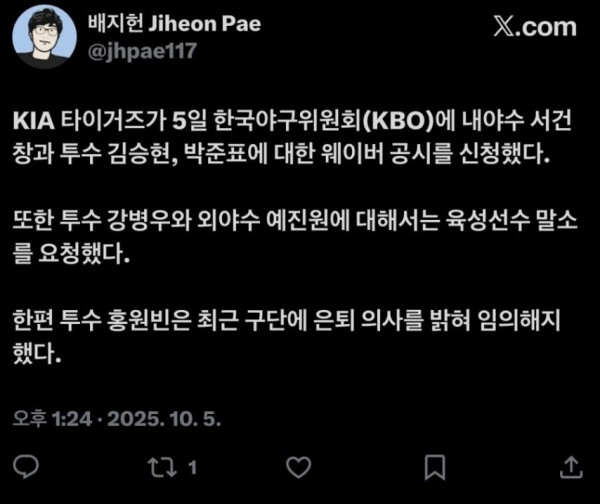 기아 방출 오피셜-서건창,김승현,박준표,예진원,강병우 방출 [정보글]