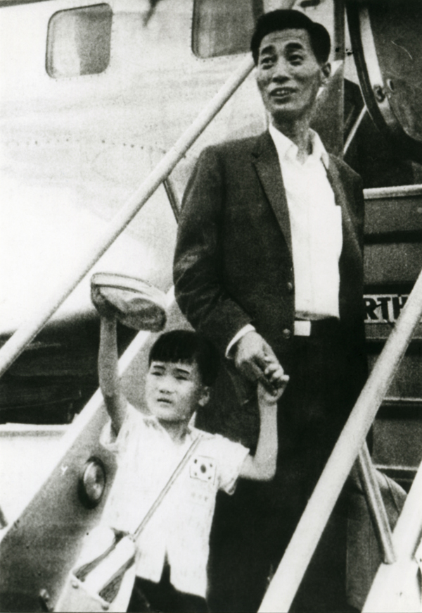 ▲ 1962년 8월 1일, 작은아버지 조남철 七단의 손을 잡고 김포공항 비행기 트랩을 올라서며 모자를 쥐고 흔들어 보이는 여섯 살 꼬마 조치훈. 이 아이는 18년 뒤 명인에 오르며 일본바둑계를 정복한다.