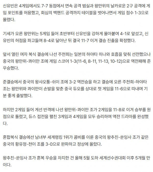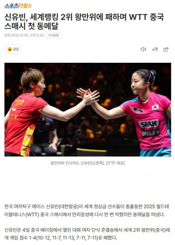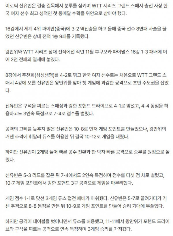 신유빈, 세계랭킹 2위 왕만위에 패하며 WTT 중국 스매시 첫 동메달