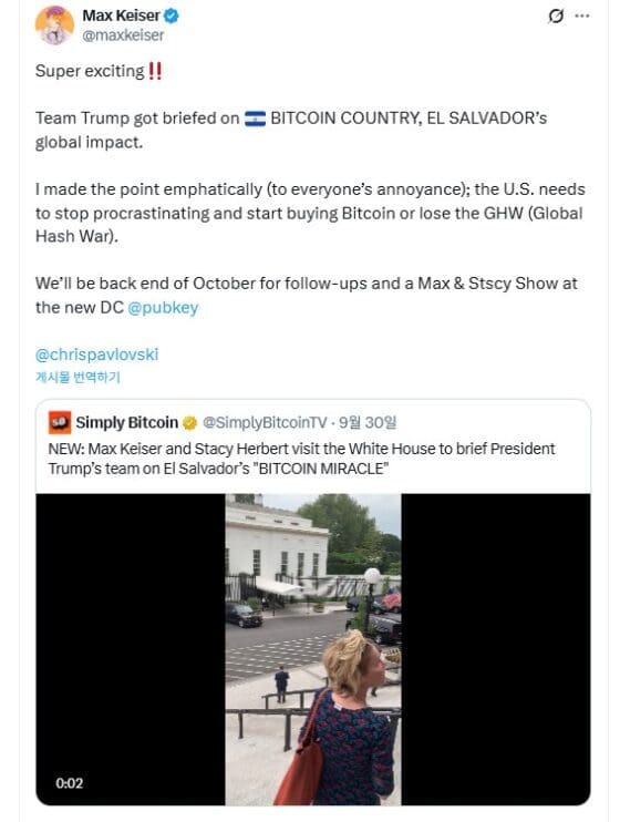 맥스 카이저, 백악관에 엘살바도르 비트코인 기적 브리핑… “미국도 매입 나서야”