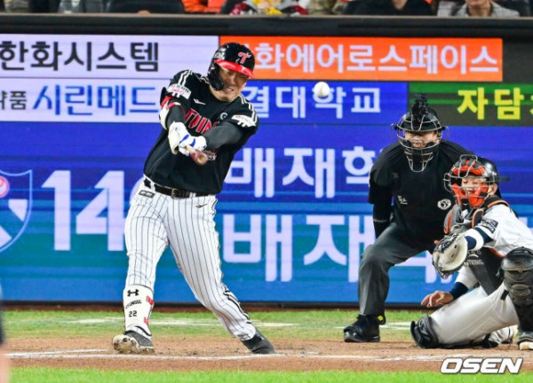 [OSEN=대전, 박준형 기자] 31일 대전 한화생명볼파크에서 2025 신한 SOL Bank KBO리그 포스트시즌 한국시리즈 5차전 한화 이글스와 LG 트윈스의 경기가 열렸다.이날 경기에 한화는 문동주를, LG는 톨허스트를 선발투수로 내세웠다. 6회초 1사 2루 LG 김현수가 1타점 적시타를 날리고 있다. 2025.10.31 / [email protected]